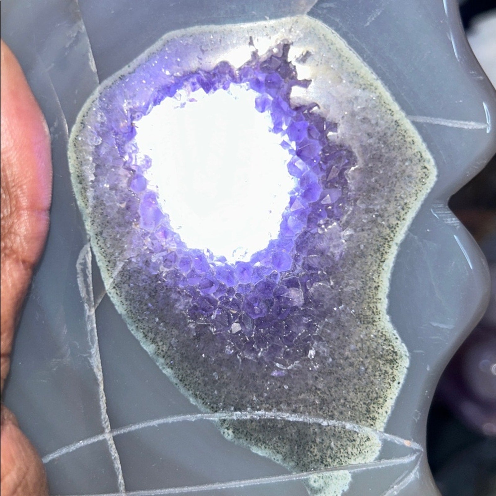 I selected the amethyst, quartz, and agate slab and watched as the artist crafted this stone into a beautiful and ethereal moon carving. Sugary druzy of amethyst goodness makes the piece play even more into a moon formation.