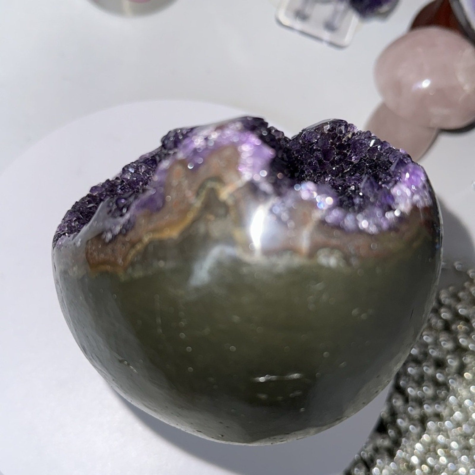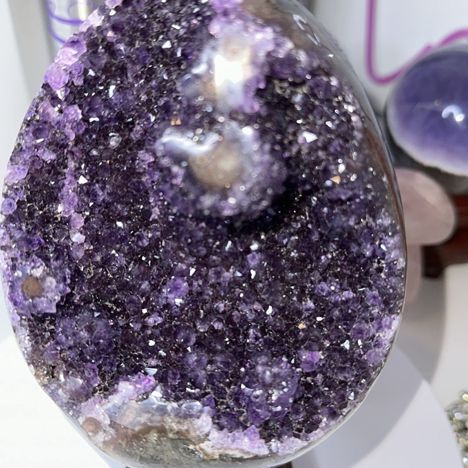 Brazilian Amethyst Egg Raw Piece (it looks like a purple dinosaur egg to me! 😂) Gorgeous Points! This piece allows you to see the beauty of a crystal rock formation - basalt-iron-quartz-amethyst developing over time!
