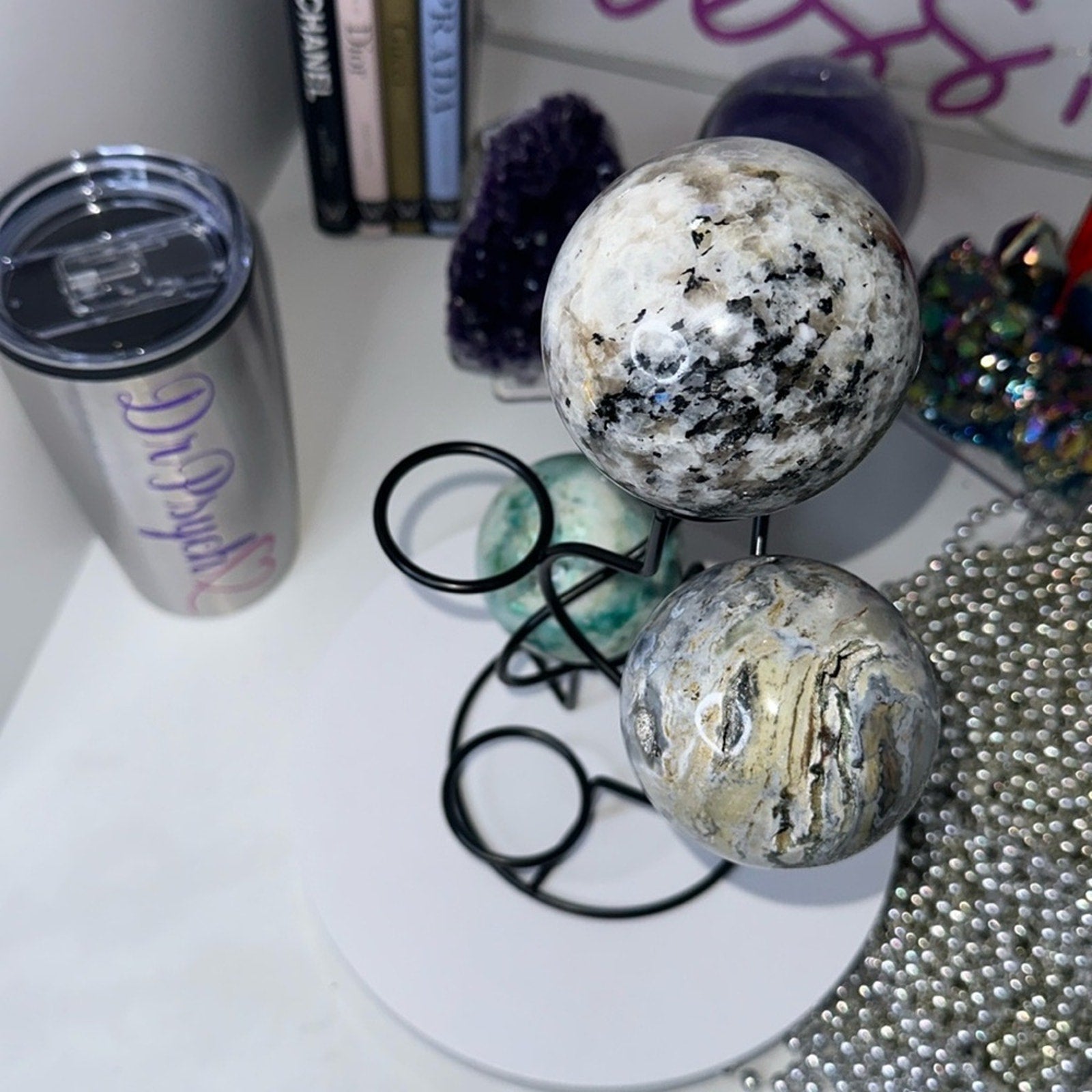 Black Multi-Sphere Tower Holder Crystals Rocks Precious Gem Spheres