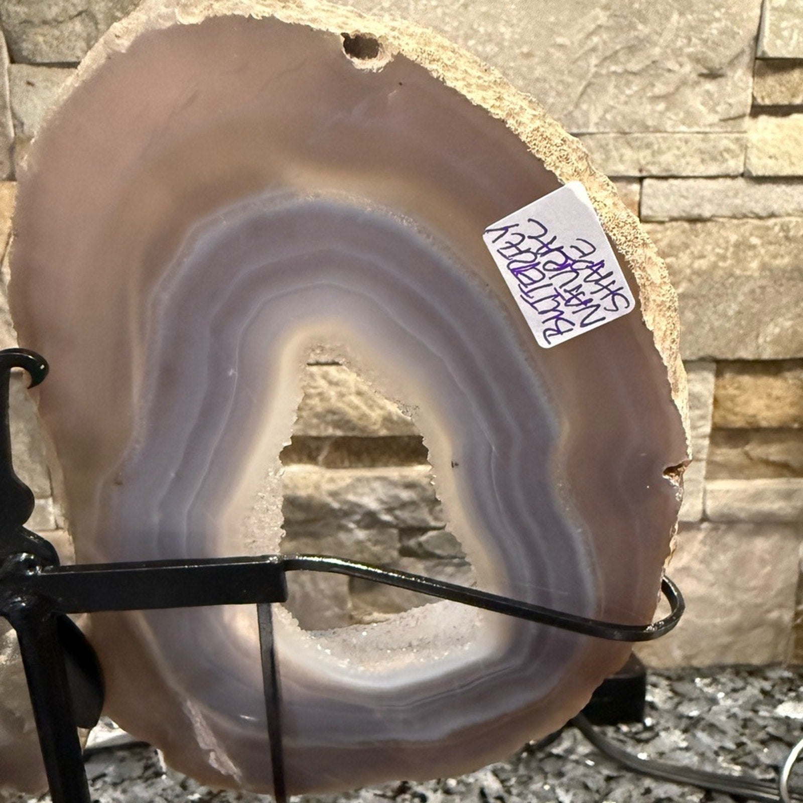 Blue Gray Agate Geode slice Butterfly on Black Stand