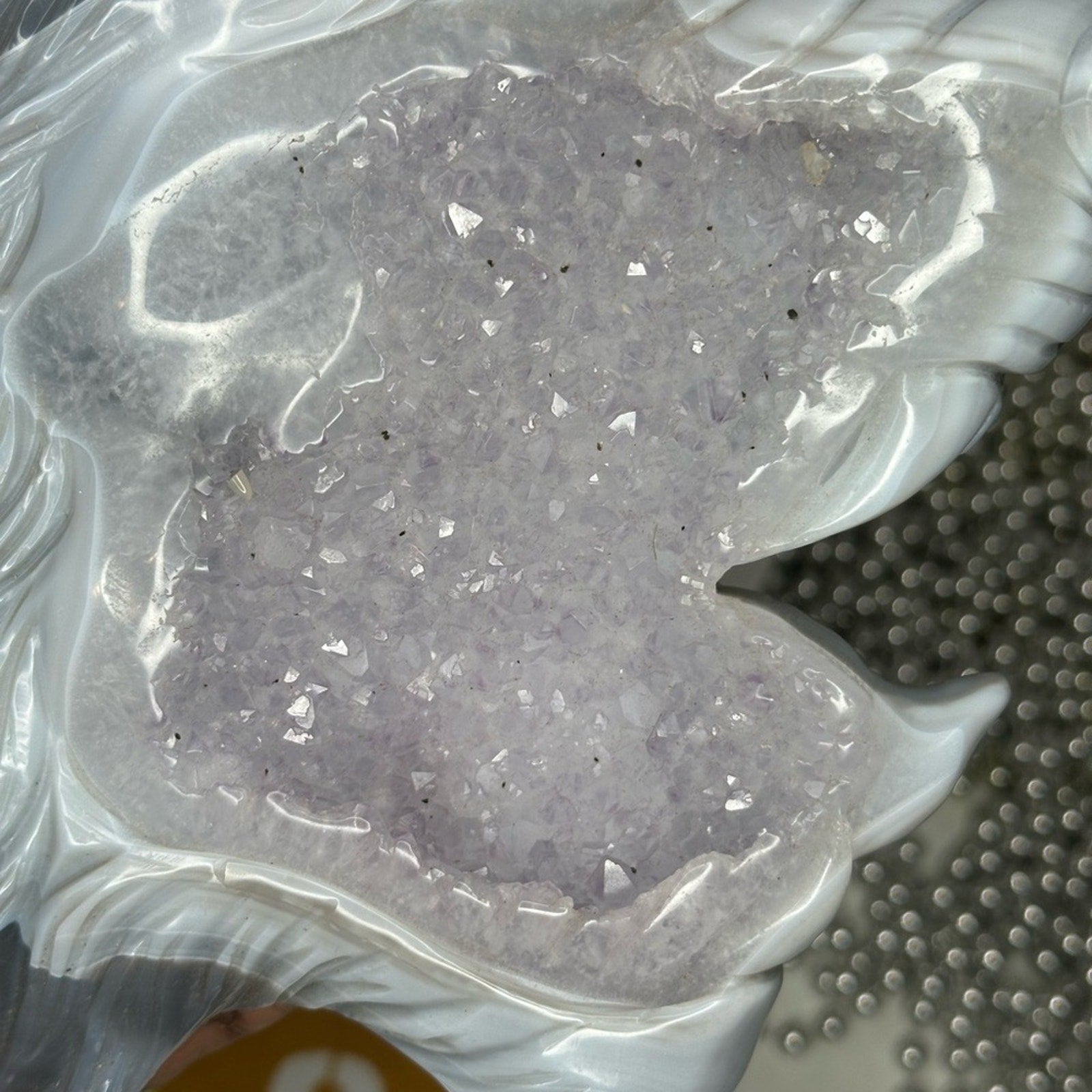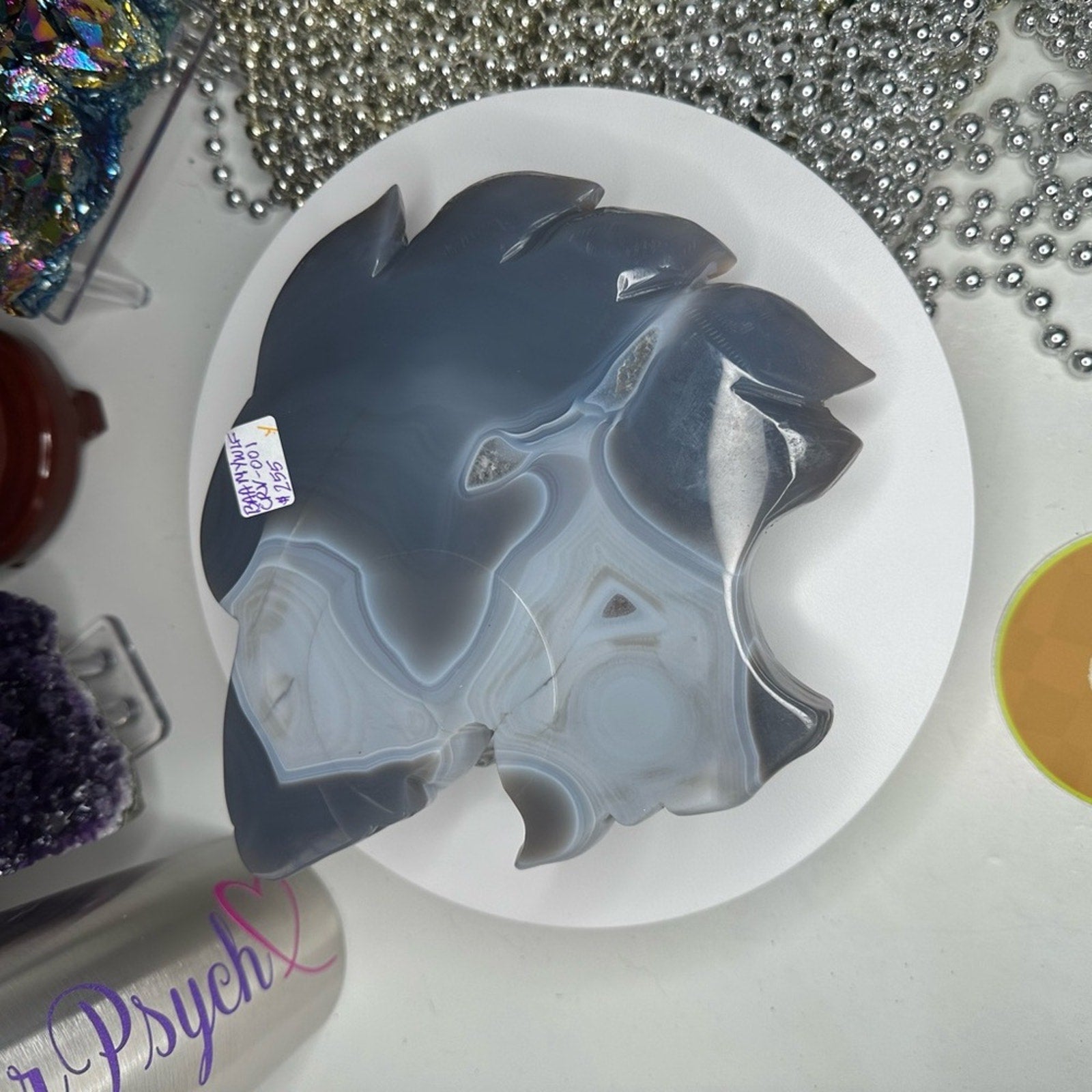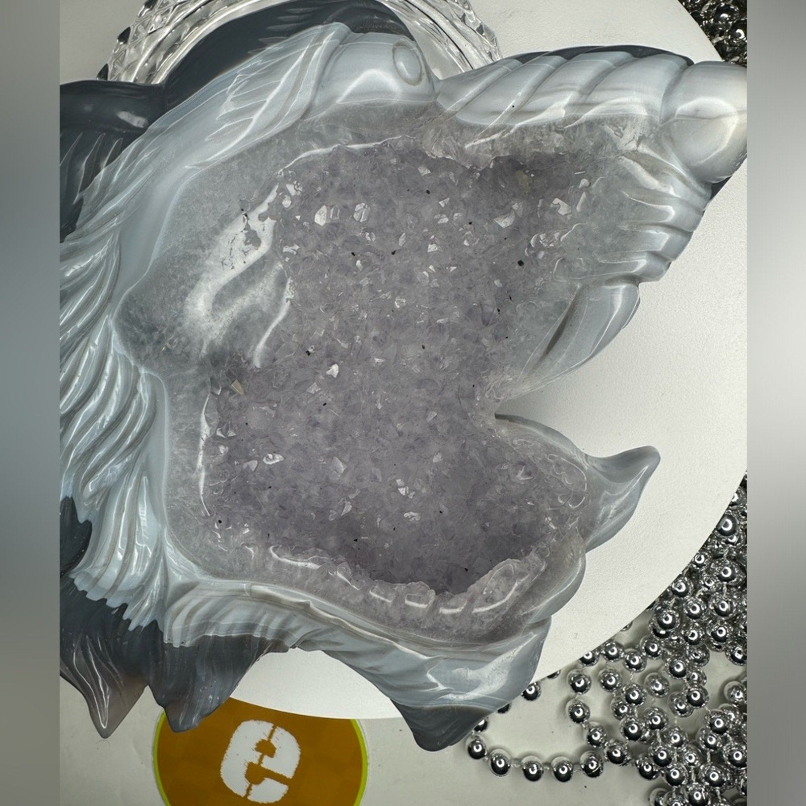Beautiful blue agate back with amethyst sugar crystal front profile. The artist outdid themselves with this carving!🌹🌹