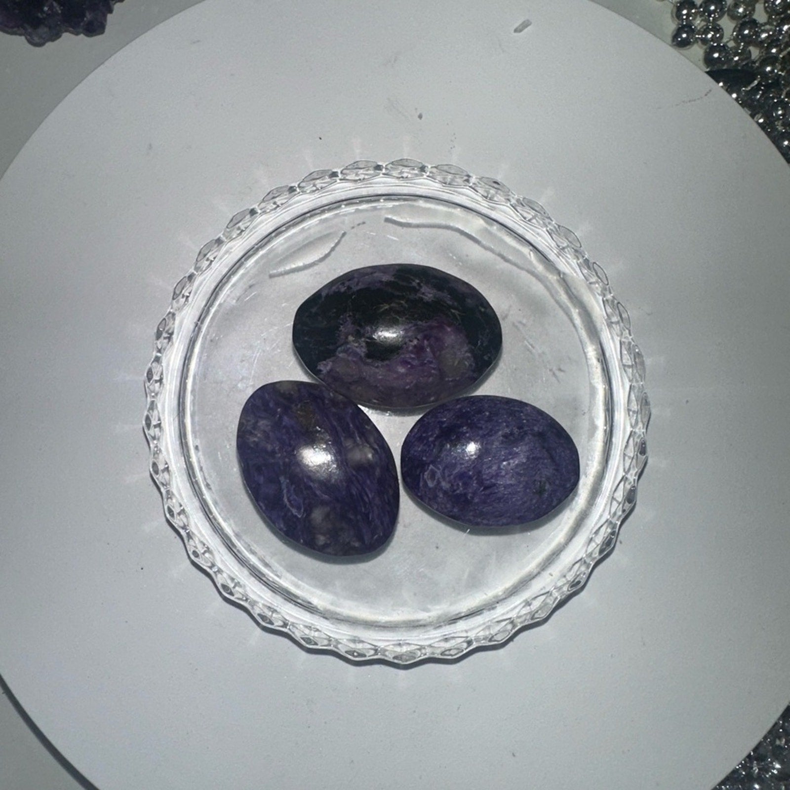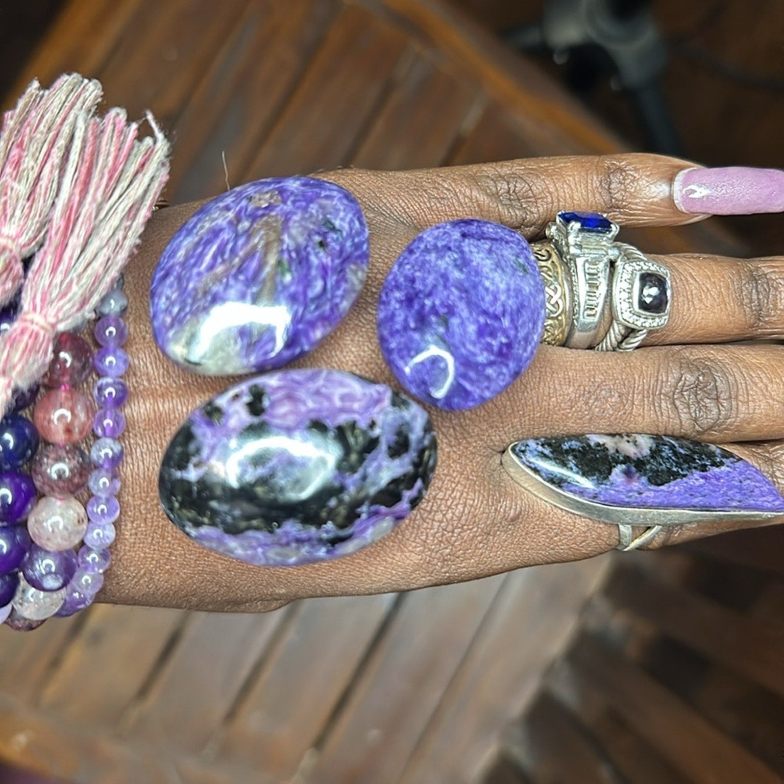 A beautiful set of 3 cabochon or Palm stone Charoite pieces. Rings in picture are not for sale!🌹🌹
