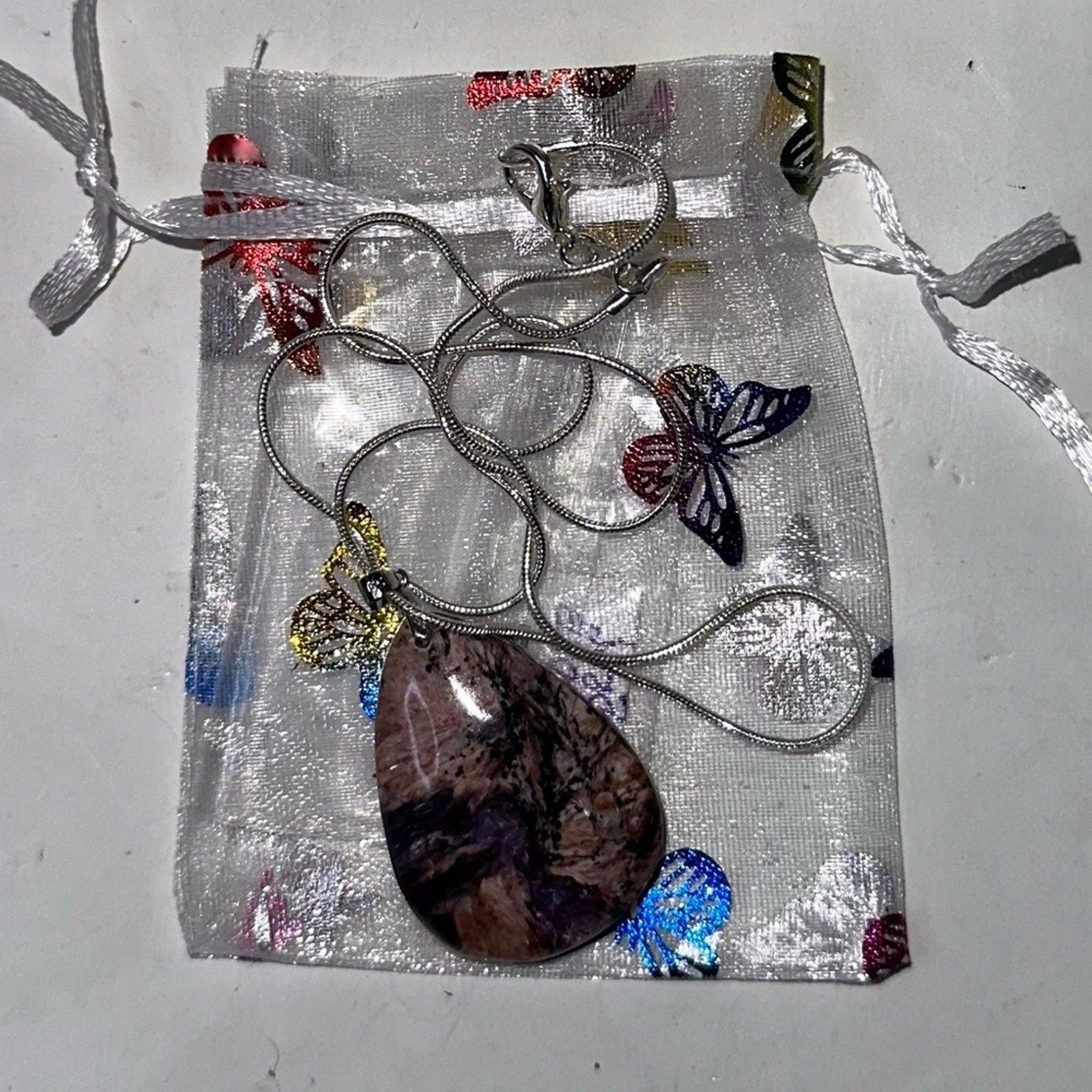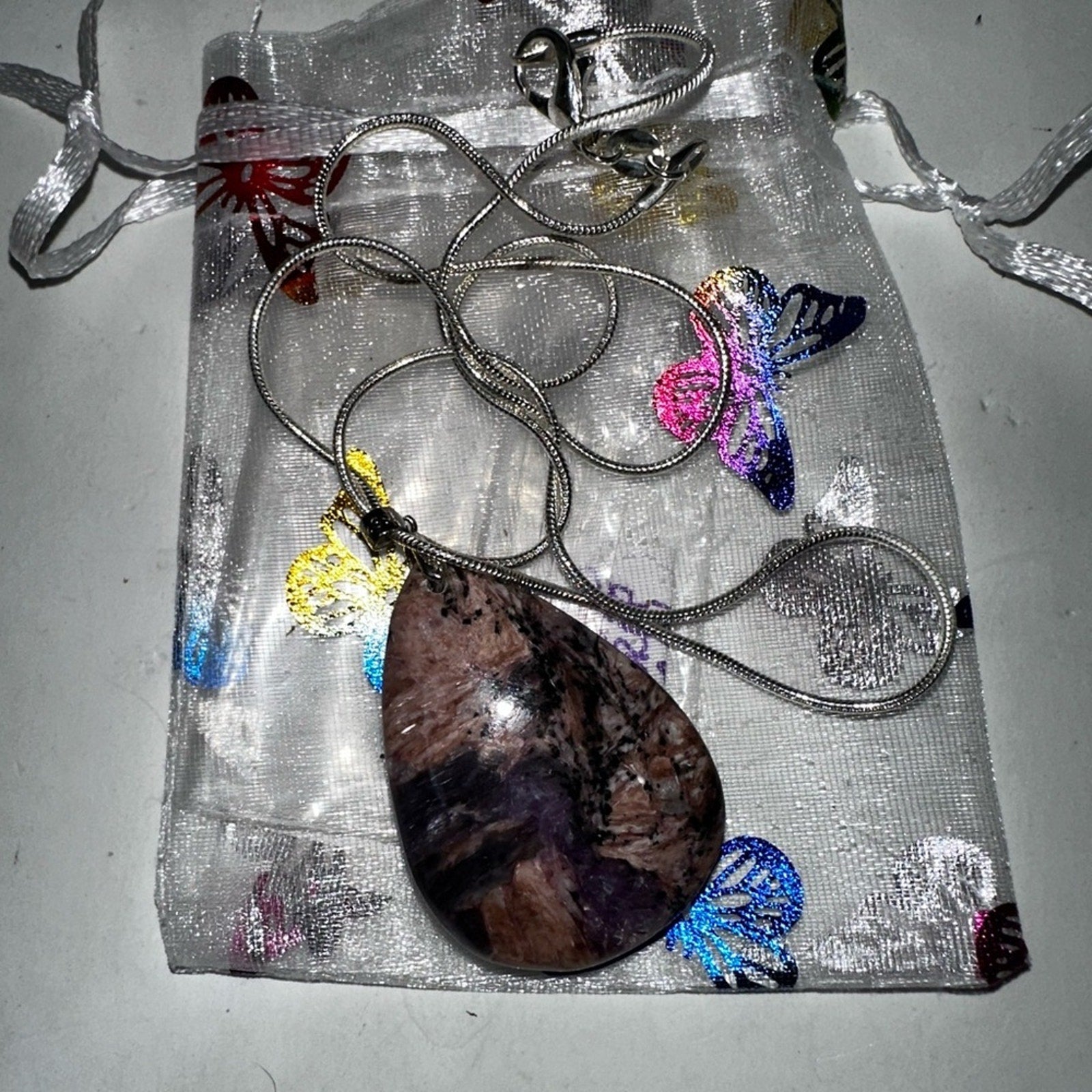 Charoite teardrop stone set on S925 bale and 18โ chain. Charoite is a gorgeous natural stone of purple beauty. ๐น๐น