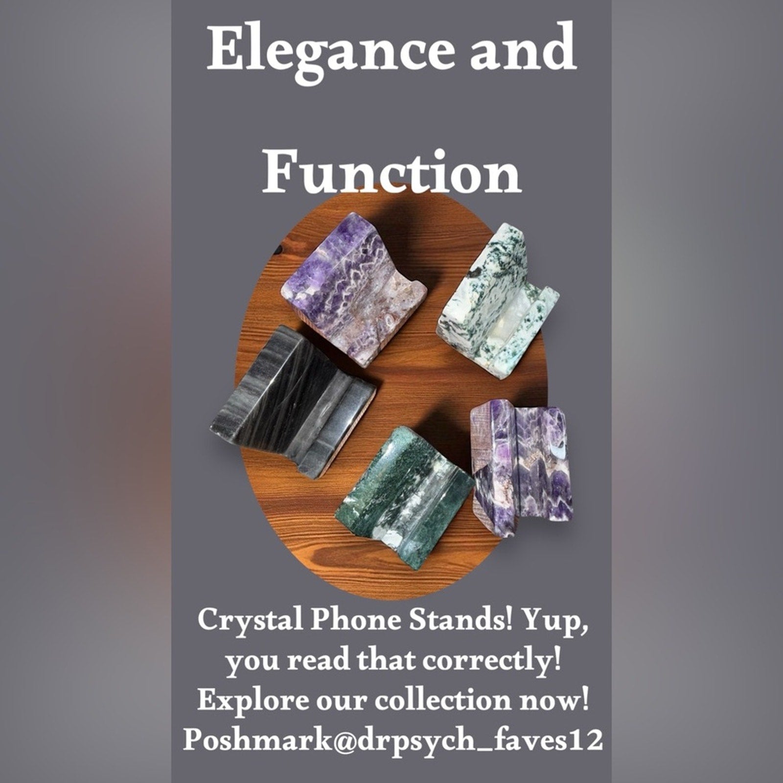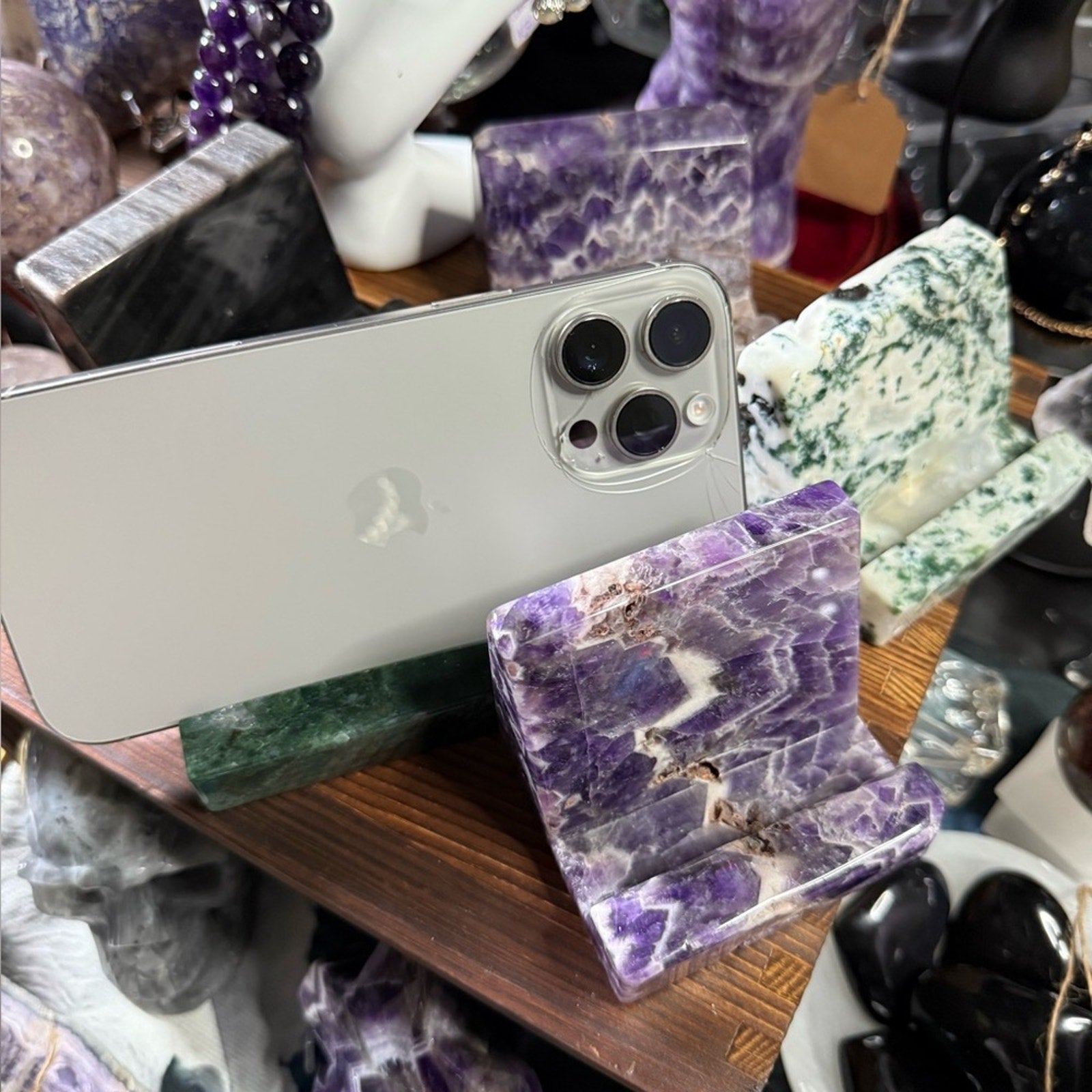 Enhance your world with this elegant crystal phone stand. Available in stunning Moss Agate (2 available). Select the one that calls to you! Add a touch of elegance and help bring calm energy to your space. Perfect for keeping your phone accessible and stylish.