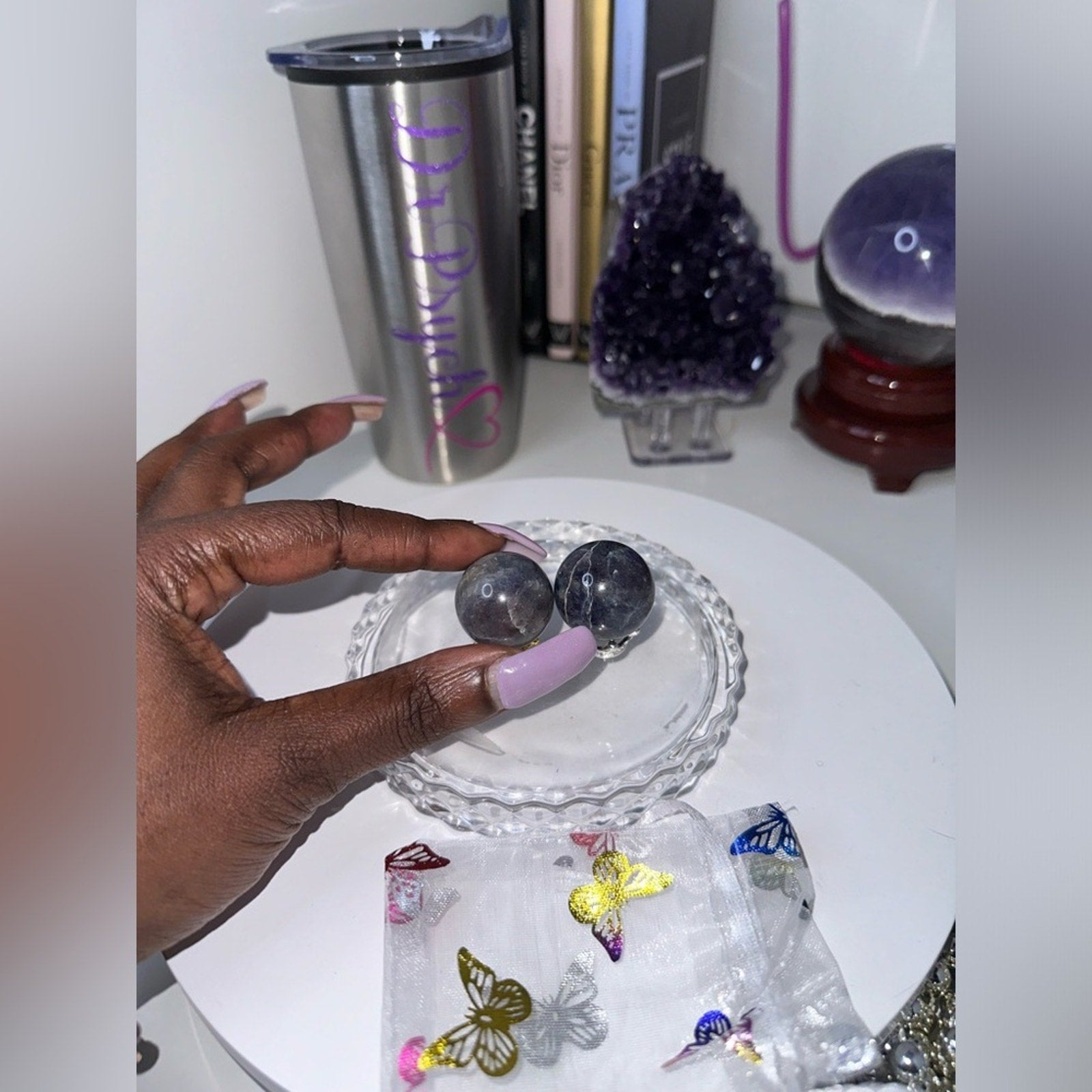 Beautiful Iolite mini spheres. Set includes 2 random, positive intention selected mini spheres delivered in a pretty pouch and with mini crown sphere holders! These would also look great in a cage pendant.