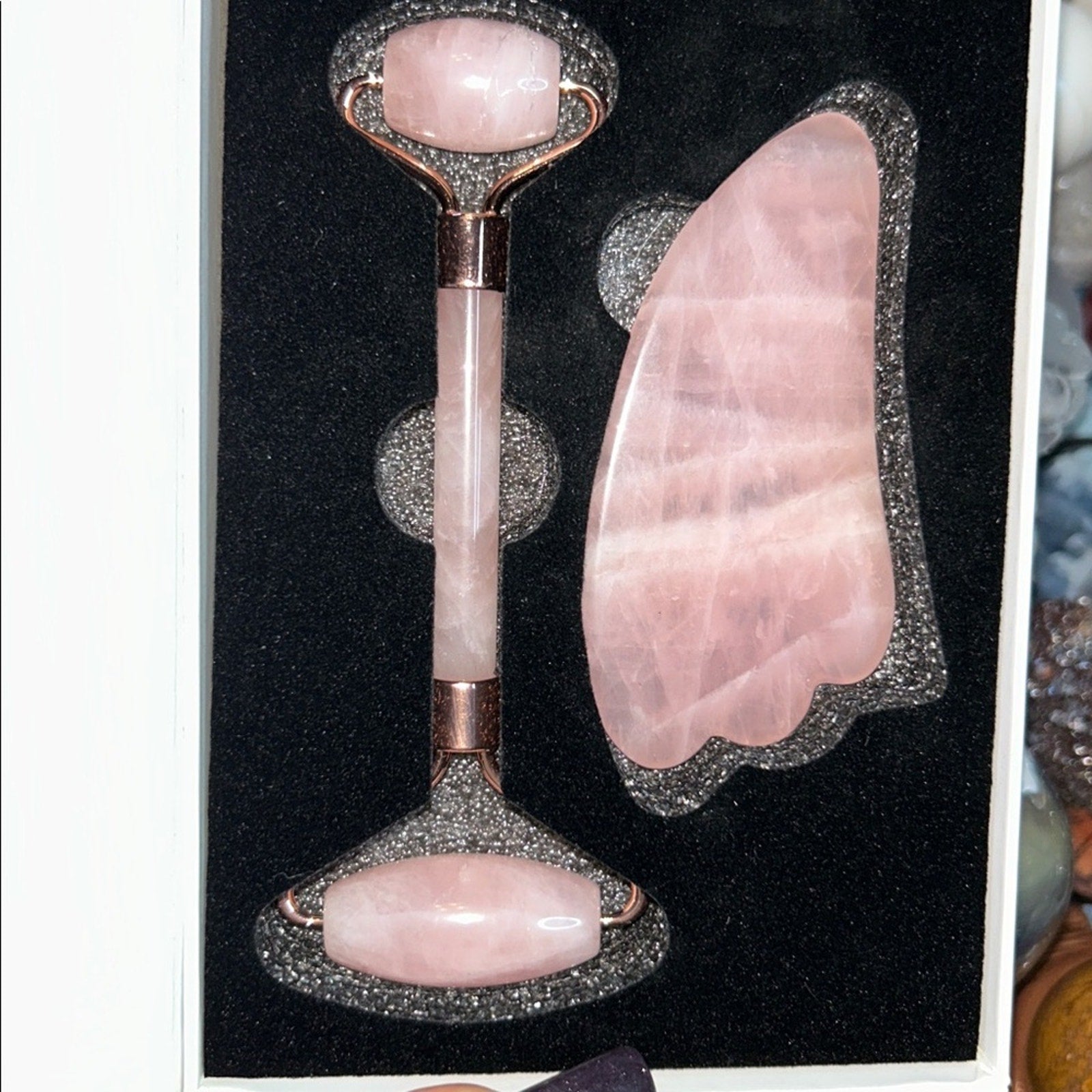 Elevate your skincare routine with this luxurious pink quartz roller and gua sha set. The soothing pink tones offer a touch of elegance, perfect for daily relaxation and skin rejuvenation.