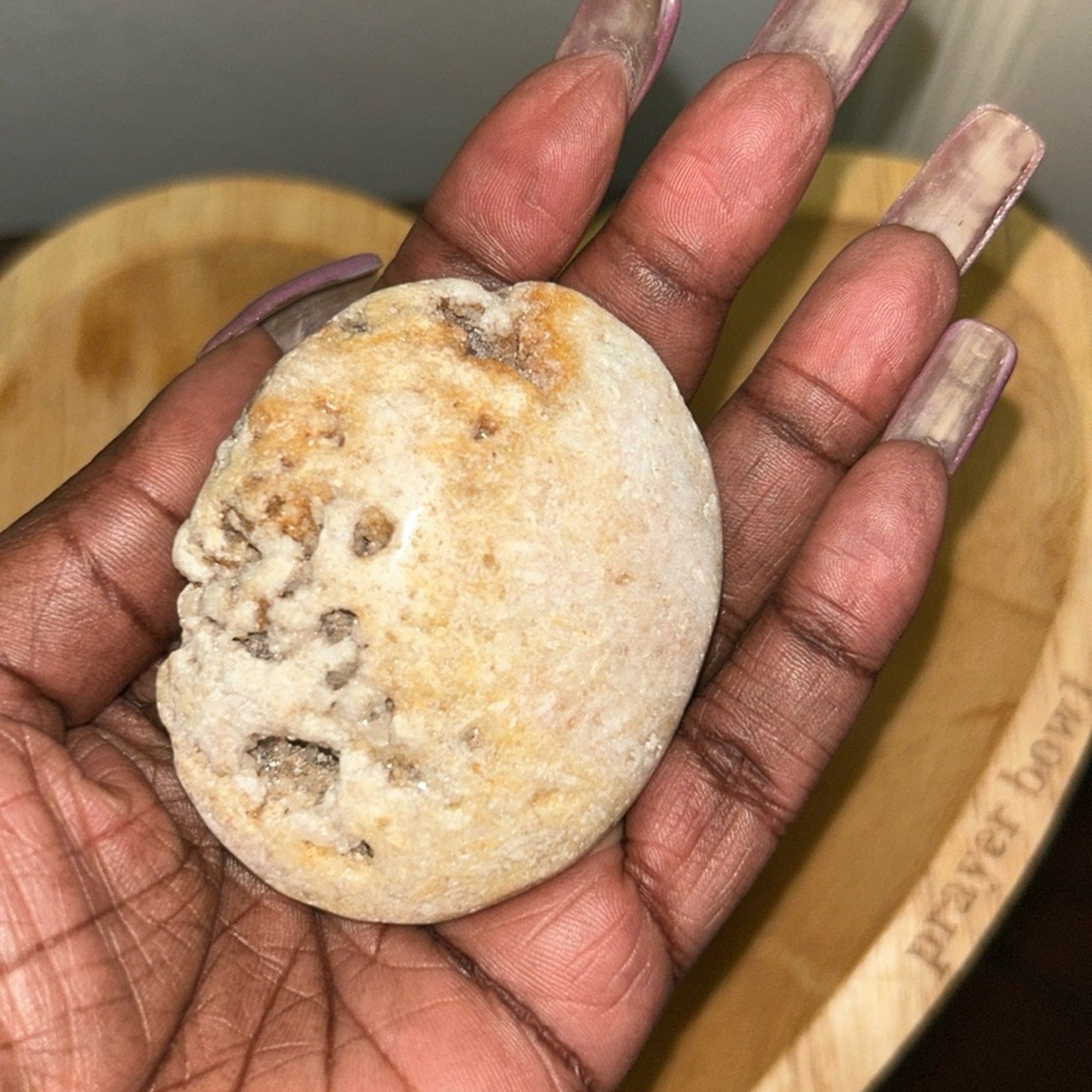 Beautiful pink amethyst, quartz, and calcite inclusion and Quartz Palm stones with druzy sections. This art piece has a little of everything! That’s a lot of crystal power in the palm of your hands!🌹🌹