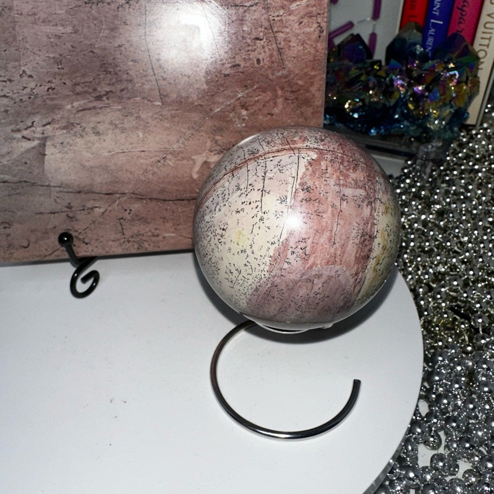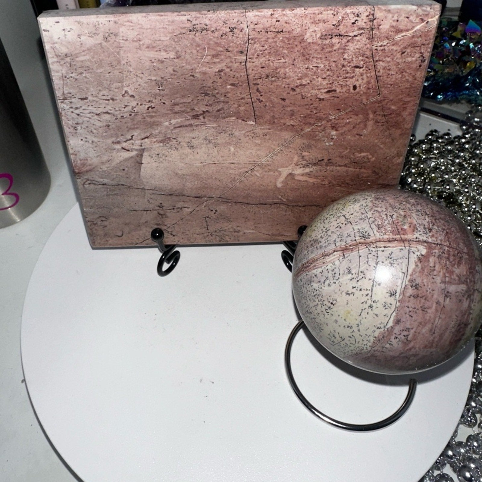 Beautiful Pink Picture Jasper and coordinating sphere cross section looks like a Japanese painting. The dendritic pattern is AMAZING! Absolutely beautiful slab that you will cherish forever. 🌹🌹